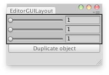 void OnGUI() { cloneTimesX = EditorGUILayout.IntSlider(cloneTimesX, 1, 10); cloneTimesY = EditorGUILayout.IntSlider(cloneTimesY, 1, 10); cloneTimesZ = EditorGUILayout.IntSlider(cloneTimesZ, 1, 10);