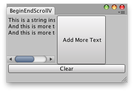 void OnGUI() { using (var h = new EditorGUILayout.HorizontalScope()) { using (var scrollView = new EditorGUILayout.ScrollViewScope(scrollPos, GUILayout.Width(100), GUILayout.Height(100))) { scrollPos = scrollView.scrollPosition; GUILayout.Label(t); } if (GUILayout.Button("Add More Text", GUILayout.Width(100), GUILayout.Height(100))) t += " \nAnd this is more text!"; } if (GUILayout.Button("Clear")) t = ""; } }