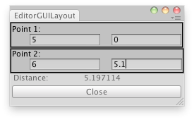 void OnGUI() { p1 = EditorGUILayout.Vector2Field("Point 1:", p1); p2 = EditorGUILayout.Vector2Field("Point 2:", p2); EditorGUILayout.LabelField("Distance:", distance.ToString()); if (GUILayout.Button("Close")) this.Close(); }