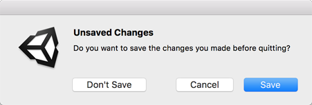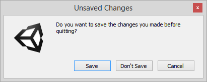 [MenuItem("Example/Quit")] static void Init() { int option = EditorUtility.DisplayDialogComplex("Unsaved Changes", "Do you want to save the changes you made before quitting?", "Save", "Cancel", "Don't Save");