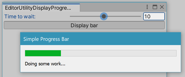 void OnGUI() { secs = EditorGUILayout.Slider("Time to wait:", secs, 1.0f, 20.0f); if (GUILayout.Button("Display bar")) { var step = 0.1f; for (float t = 0; t < secs; t += step) { EditorUtility.DisplayProgressBar("Simple Progress Bar", "Doing some work...", t / secs); // Normally, some computation happens here. // This example uses Sleep. Thread.Sleep((int)(step * 1000.0f)); } EditorUtility.ClearProgressBar(); } } }