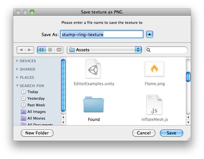 public class SaveFilePanelInProjectExample : EditorWindow { [MenuItem("Example/Save Texture In Project")] static void Apply() { Texture2D texture = Selection.activeObject as Texture2D; if (texture == null) { EditorUtility.DisplayDialog("Select Texture", "You must select a texture first!", "OK"); return; }