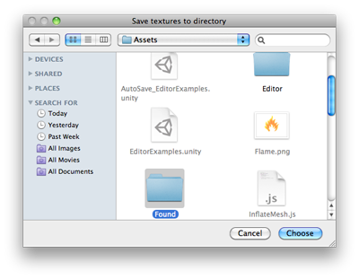 public class SaveFolderPanelExample : EditorWindow { [MenuItem("Example/Save Textures To Folder")] static void Apply() { Object[] textures = Selection.GetFiltered(typeof(Texture2D), SelectionMode.Unfiltered); if (textures.Length == 0) { EditorUtility.DisplayDialog("Select Textures", "You must select at least one texture first!", "OK"); return; }