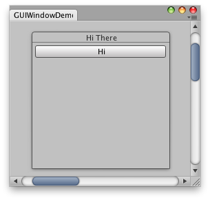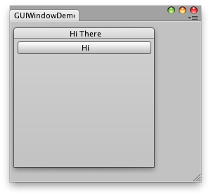 // The window function. This works just like ingame GUI.Window void DoWindow(int unusedWindowID) { GUILayout.Button("Hi"); GUI.DragWindow(); }