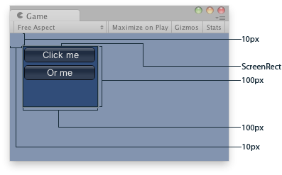 public class ExampleScript : MonoBehaviour { void OnGUI() { GUILayout.BeginArea(new Rect(10, 10, 100, 100)); GUILayout.Button("Click me"); GUILayout.Button("Or me"); // Ends the area started above GUILayout.EndArea(); } }