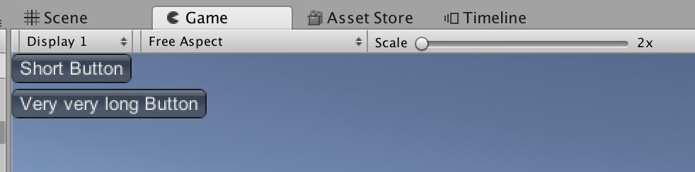 public class ExampleClass : MonoBehaviour { void OnGUI() { GUILayout.BeginVertical(); GUILayout.Button("Short Button", GUILayout.ExpandWidth(false)); GUILayout.Button("Very very long Button"); GUILayout.EndVertical(); } }