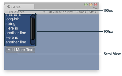 // The string to display inside the scrollview. 2 buttons below add & clear this string. public string longString = "This is a long-ish string";