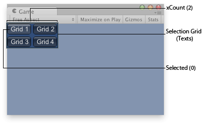 void OnGUI() { GUILayout.BeginVertical("Box"); selGridInt = GUILayout.SelectionGrid(selGridInt, selStrings, 1); if (GUILayout.Button("Start")) { Debug.Log("You chose " + selStrings[selGridInt]); } GUILayout.EndVertical(); } }