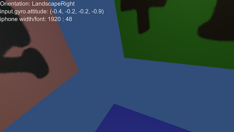 GUILayout.Label("Orientation: " + Screen.orientation); GUILayout.Label("input.gyro.attitude: " + Input.gyro.attitude); GUILayout.Label("iphone width/font: " + Screen.width + " : " + GUI.skin.label.fontSize); }
