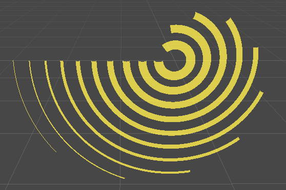 // Display arcs of various angles and thickness in the scene view [CustomEditor(typeof(ExampleScript))] public class ExampleEditor : Editor { public void OnSceneGUI() { var t = target as ExampleScript; var tr = t.transform; var position = tr.position; Handles.color = Color.yellow; for (int i = 0; i < 10; ++i) { var center = position; var start = Vector3.left; var normal = Vector3.forward; var radius = 3 - i * 0.3f; var angle = 40 + 30 * i; Handles.DrawWireArc(center, normal, start, angle, radius, i); } } }