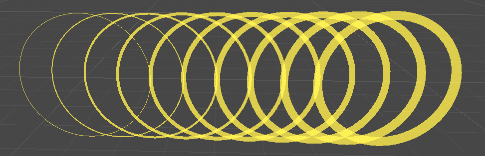 // Displays circles of various thickness in the scene view [CustomEditor(typeof(ExampleScript))] public class ExampleEditor : Editor { public void OnSceneGUI() { var t = target as ExampleScript; var tr = t.transform; var position = tr.position; Handles.color = Color.yellow; for (int i = 0; i < 10; ++i) { Handles.DrawWireDisc(position + Vector3.right * i, Vector3.forward, 2, i); } } }