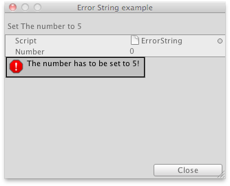 public class ErrorString : ScriptableWizard { public int number = 0; [MenuItem("Example/Show Error String")] static void CreateWindow() { ScriptableWizard.DisplayWizard("Error String example", typeof(ErrorString), "Close"); }