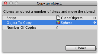 public class CloneObjects : ScriptableWizard { public GameObject objectToCopy = null; public int numberOfCopies = 2; [MenuItem("Example/Clone objects")] static void CreateWindow() { // Creates the wizard for display ScriptableWizard.DisplayWizard("Clone an object.", typeof(CloneObjects), "Clone!"); }