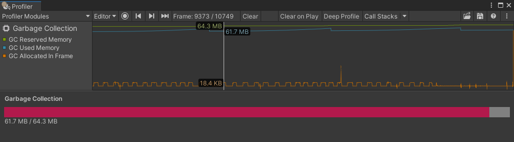 [Serializable] [ProfilerModuleMetadata("Garbage Collection")] public class GarbageCollectionProfilerModule : ProfilerModule { static readonly ProfilerCounterDescriptor[] k_ChartCounters = new ProfilerCounterDescriptor[] { new ProfilerCounterDescriptor("GC Reserved Memory", ProfilerCategory.Memory), new ProfilerCounterDescriptor("GC Used Memory", ProfilerCategory.Memory), new ProfilerCounterDescriptor("GC Allocated In Frame", ProfilerCategory.Memory), };